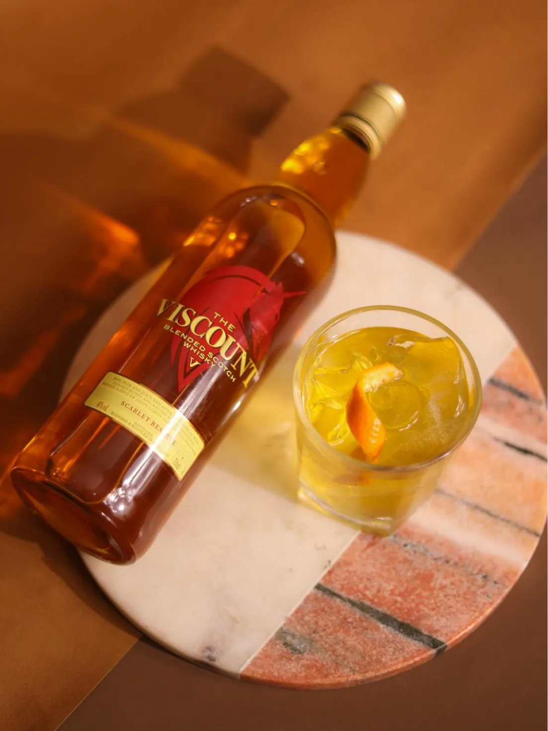 Ingredients: Viscount whiskey, smoked honey syrup, orange bitters, ice
